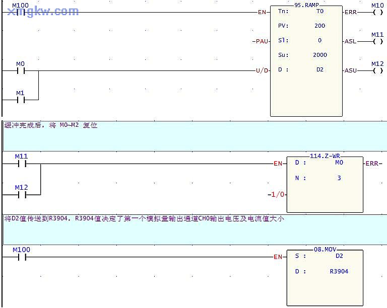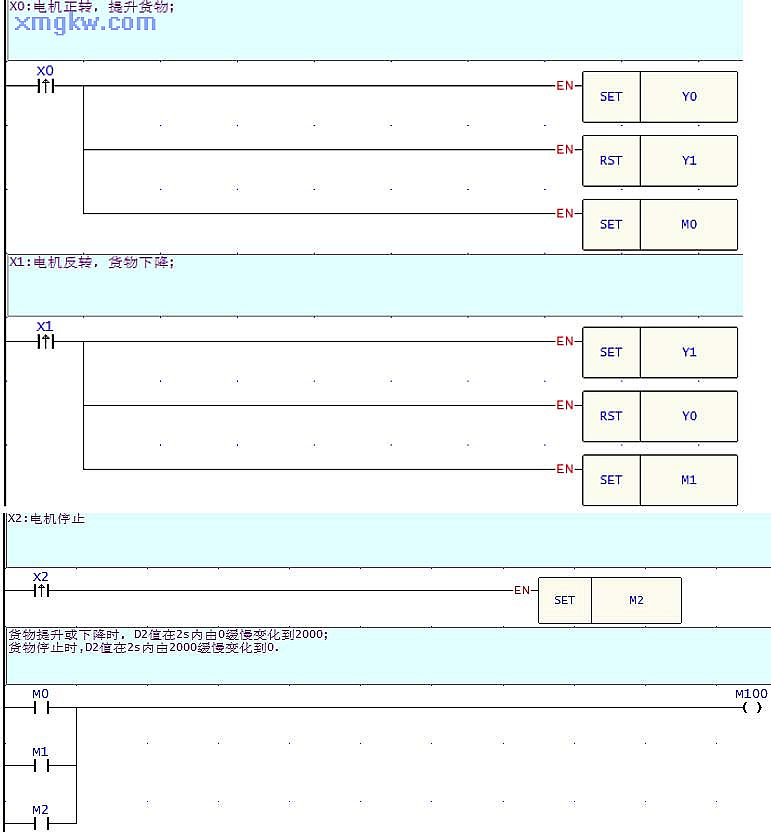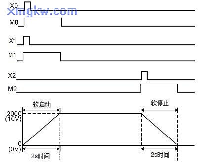 起重機(jī)在提升貨物時(shí),按下提升按鈕, M0=ON,執(zhí)行軟啟動(dòng)動(dòng)作,在 2s內(nèi)電壓輸出值從 0V變化到10V,到達(dá)預(yù)定高度后,按下停止按鈕, M2=ON,執(zhí)行軟停止動(dòng)作,在 2s內(nèi)電壓輸出值從 10V變化到0V。動(dòng)作過(guò)程如下圖所示: