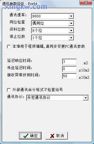 【PLC通訊參數(shù)設(shè)置】 點選菜單欄的“ PLC”?“設(shè)定” ?“Port4通訊參數(shù)”,通訊格式為 9600,E,8,1。如下圖所示: