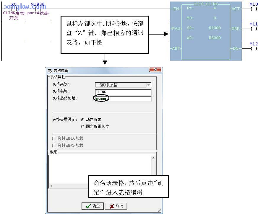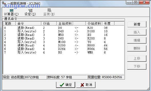 (2)從上圖狀態(tài)欄可看出,編輯此 8條通訊命令共占用了 57個(gè)緩存器R5000~R5056;