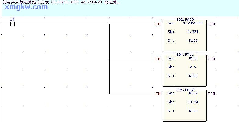 - X1=ON,運(yùn)算開(kāi)始執(zhí)行,首先將浮點(diǎn)數(shù) 1.236與1.324相加,結(jié)果存放于 D100。