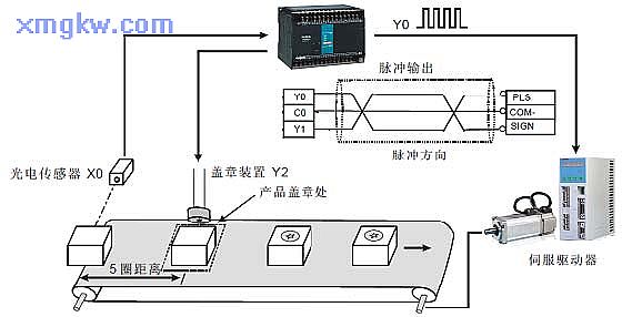 【控制要求】當(dāng)光電開(kāi)關(guān)感應(yīng)到有產(chǎn)品進(jìn)入傳送帶上時(shí),伺服電機(jī)將旋轉(zhuǎn) 5圈,將將產(chǎn)品送到蓋章處進(jìn)行蓋章,蓋章動(dòng)作持續(xù)時(shí)間為 2秒。