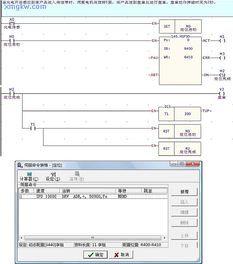 當(dāng)感應(yīng)到產(chǎn)品時(shí),光電檢測(cè)開(kāi)關(guān) X0由OFF→ON變化一次, SET指令執(zhí)行, M0被置位為 ON,其常開(kāi)接點(diǎn)閉合, HSPSO指令執(zhí)行, Y0開(kāi)始輸出頻率為 10KHz的脈沖。