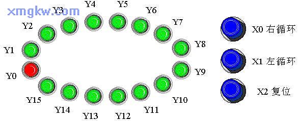 按下右循環(huán)按鈕, 16個(gè)霓虹燈按照由小到大的編號(hào)( Y0~Y15)依次各亮 200ms后熄滅。