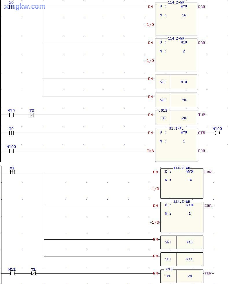 X2 由OFF→ON變化一次, Y0~Y15,M10~M11都被復(fù)位,霓虹燈停止工作。需注意的是,在X0,X1上升沿接點(diǎn)后面的 Z-WR 指令目的在于每次左右循環(huán)狀態(tài)切換時(shí),所有燈處于熄滅狀態(tài),保證從 Y0或者Y15開(kāi)始點(diǎn)亮。