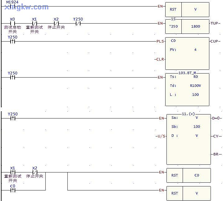 T250的上升沿接點(diǎn)計(jì)數(shù)滿 4次以后,整個(gè)測(cè)試過程結(jié)束。如果需要對(duì)待測(cè)設(shè)備進(jìn)行重復(fù)測(cè)試,只需要將 X1由 OFF→ON動(dòng)作一次即可。當(dāng) X2=ON時(shí),停止測(cè)試, PLC不再對(duì)待測(cè)設(shè)備采集數(shù)據(jù),同時(shí)清除計(jì)數(shù)器 C0。