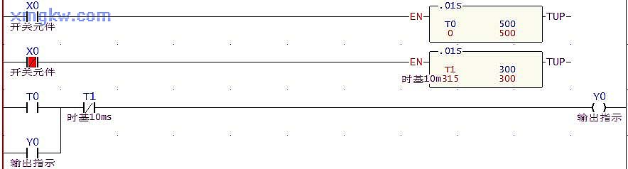 【控制需求】開關(guān)由 OFF→ON動作時,延遲 5秒鐘后指示燈才被點亮;開關(guān)由 ON→OFF動作時,延遲 3秒后指示燈才熄滅。