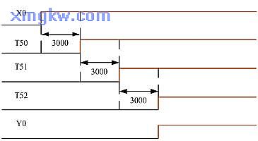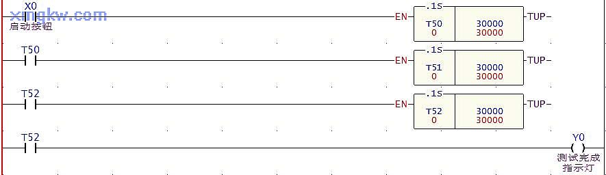 當(dāng)按下啟動按鈕后, X0=ON,定時器 T50開始計(jì)時,經(jīng)過 100ms×30000=3000s后,T50常開接點(diǎn)導(dǎo)通, T51開始計(jì)時,又經(jīng)過 100ms×30000=3000s后, T51常開接點(diǎn)導(dǎo)通, T52開始計(jì)時,再經(jīng)過 100ms×30000=3000s后,T2常開接點(diǎn)導(dǎo)通, Y0=ON,老化測試完成指示燈點(diǎn)亮。老化測試的總時間為 3000s + 3000s + 3000s = 9000s =150分鐘 =2.5小時。