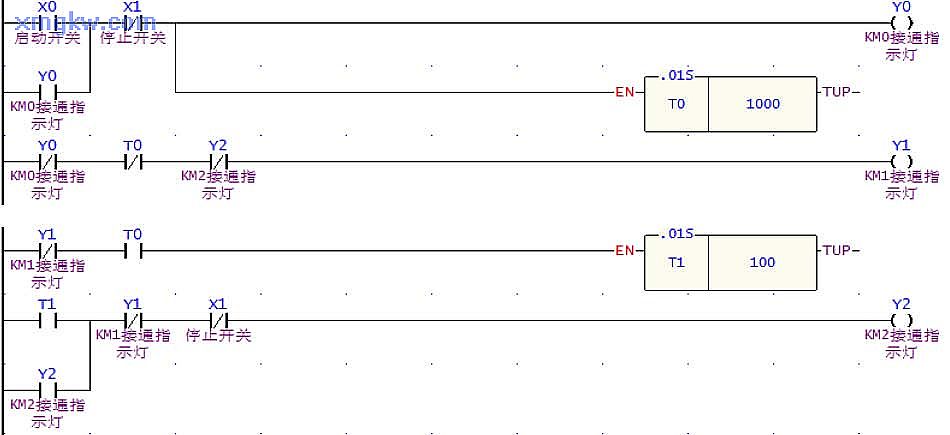 2. T0計(jì)時器到達(dá) 10秒預(yù)設(shè)值后, T0=ON,Y1=OFF,T1計(jì)時器開始計(jì)時,到達(dá) 1s預(yù)設(shè)值后, T1=ON,所以 Y2=ON,三角形正常運(yùn)行接觸器 KM2導(dǎo)通。