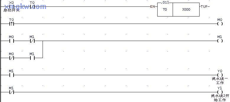 T0的常閉接點(diǎn)作為定時(shí)器指令執(zhí)行的條件,定時(shí)器 T0到達(dá)30秒的預(yù)設(shè)值時(shí), T0由 OFF→ON變化一次,觸發(fā)電路執(zhí)行, M1的狀態(tài)改變,一條流水線運(yùn)行。