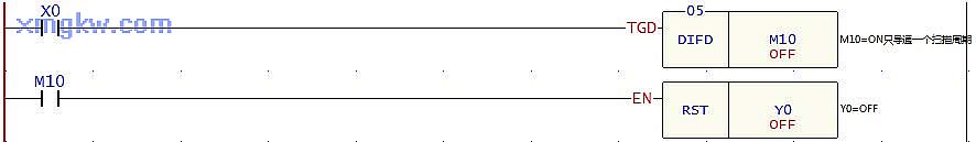 【控制要求】 開關(guān)由 ON→OFF動作時產(chǎn)生一個掃描周期的脈沖 M10,作為條件去觸發(fā)指示燈或其他裝置。