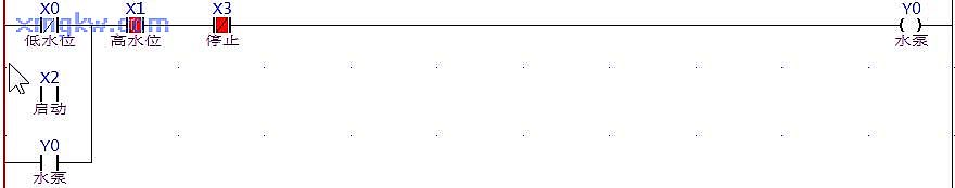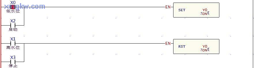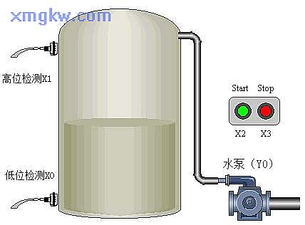【控制要求】水塔儲水控制:當按下 START按鈕 X2或塔內儲水量低于低水位檢測光電 X0時,水泵( Y0)開始運行,抽水至水塔內;當按下 STOP按鈕 X3或塔內儲水量高于高水位檢測光電 X1時,水泵停止抽水工作。